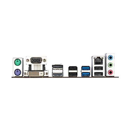 External I/O Ports | 1 x PS/2 keyboard port 1 x PS/2 mouse port 1 x D-Sub port 1 x DVI-D port 1 x DisplayPort 1 x HDMI 2.0 port 2 x USB 3.2 Gen 1 ports 4 x USB 2.0/1.1 ports 1 x RJ-45 port 3 x audio jacks |
